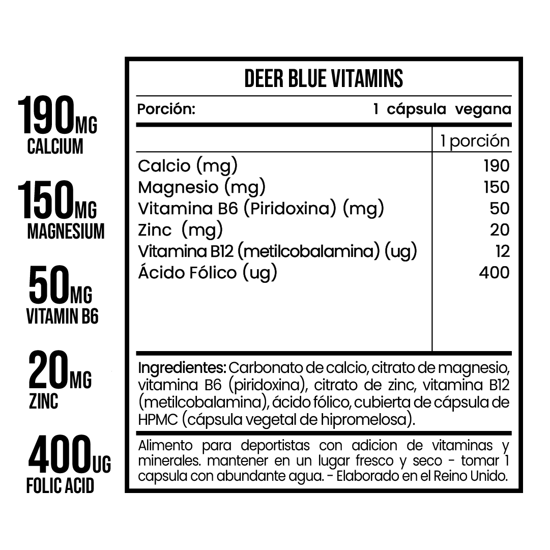 Carbonato de calcio, citrato de magnesio, vitamina B6 (piridoxina), citrato de zinc, vitamina B12 (metilcobalamina), ácido fólico, cubierta de cápsula de HPMC (cápsula vegetal de hipromelosa). Fabricado en el Reino Unido.