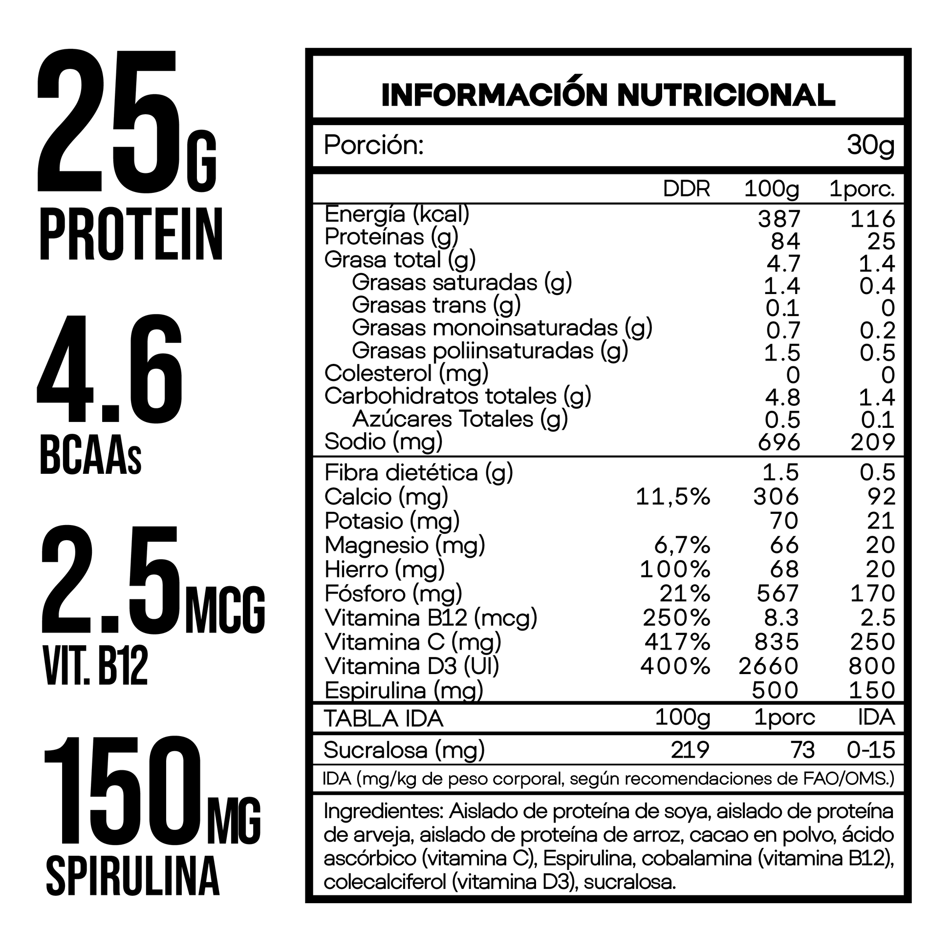 Aislado de proteína de soya (soja), aislado de proteína de guisantes (arveja), aislado de proteína de arroz, maltodextrina, cacao en polvo, acido ascórbico (vitamina C), espirulina, cobalamina (vitamina B12), colecalciferol (vitamina D3), lactobacillus acidophilus (probiótico), edulcorante sucralosa.