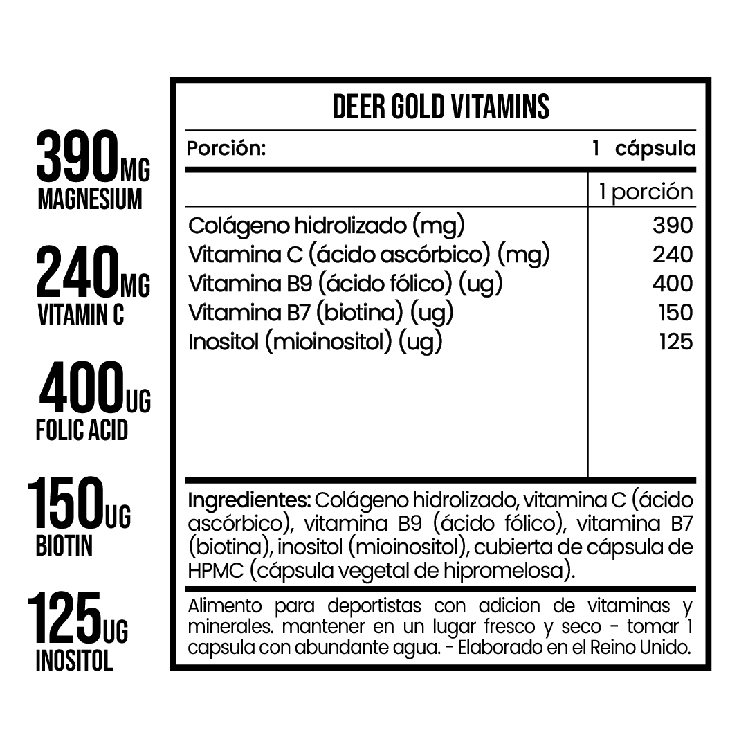Colágeno hidrolizado, vitamina C (ácido ascórbico), vitamina B9 (ácido fólico), vitamina B7 (biotina), inositol (mioinositol), citrato de magnesio, cubierta de cápsula de HPMC (cápsula vegetal de hipromelosa). Fabricado en el Reino Unido.
