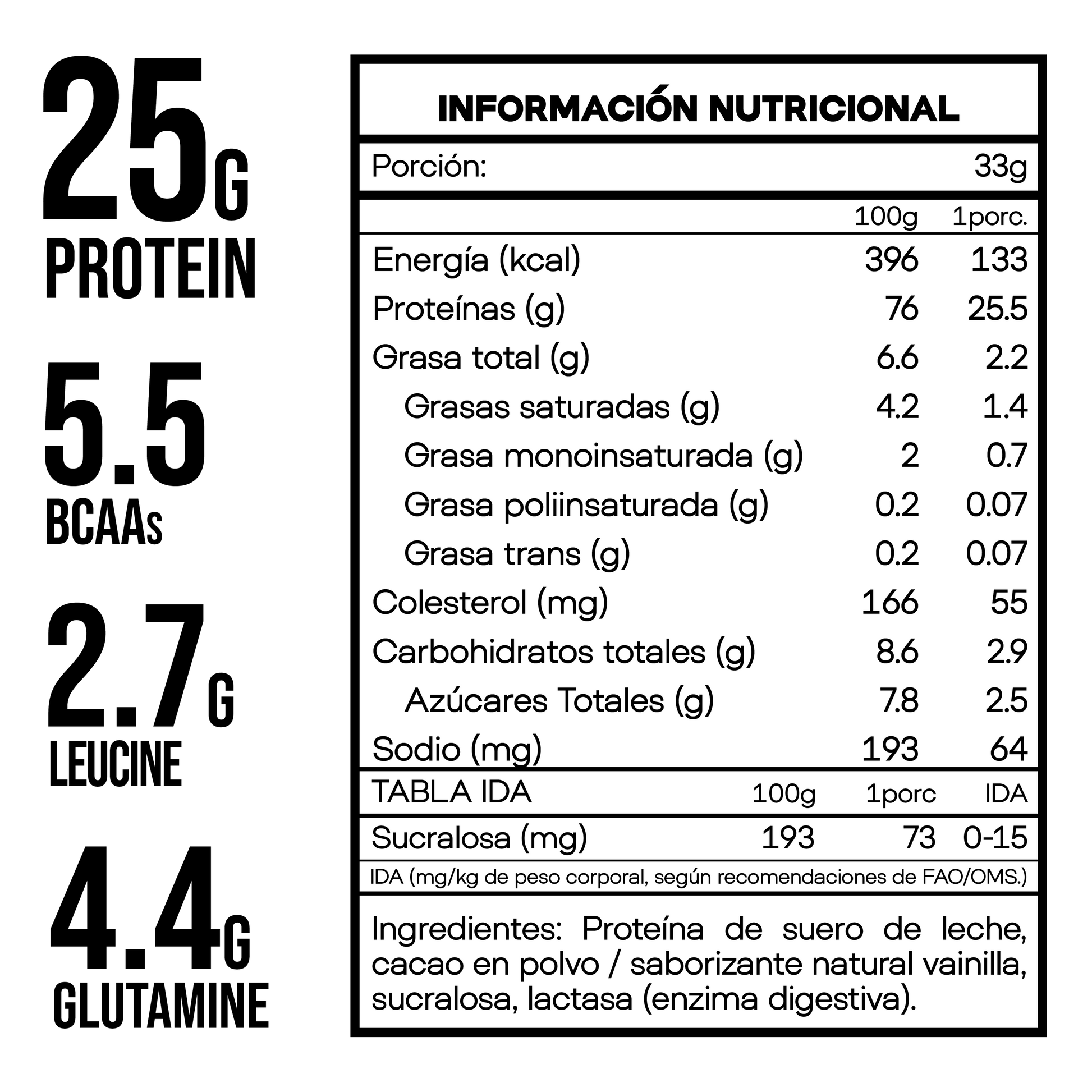 Proteína de suero de leche, saborizante natural (vainilla o cacao), sucralosa, lactasa (enzima digestiva).