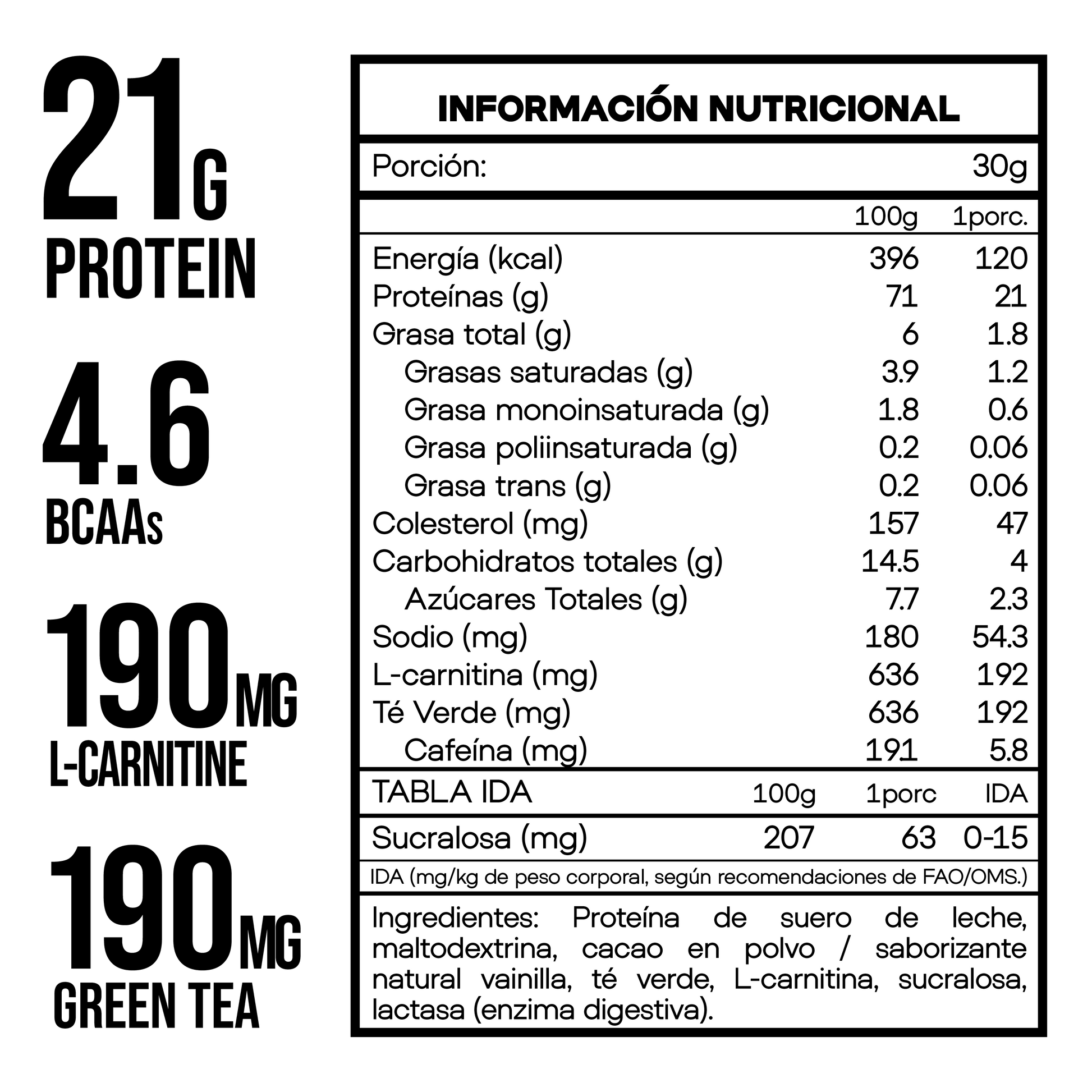 Proteína de suero de leche, extracto de té verde, L-carnitina, saborizante natural (cacao o vainilla), lactasa (enzima digestivo), edulcorante sucralosa.