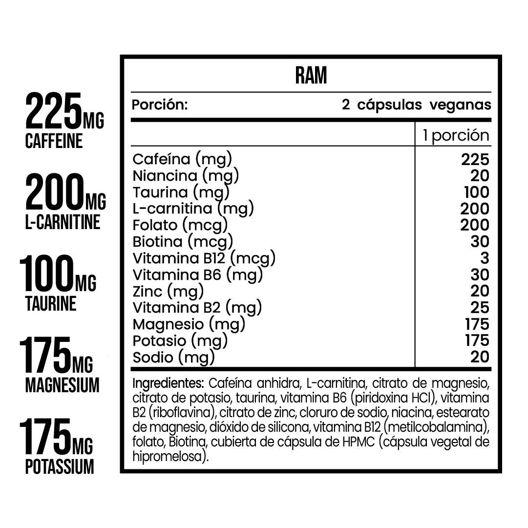 Para complementar el efecto energético y quemador, Ram cuenta con electrolitos para mantenerte hidratado y retrasar la fatiga muscular.