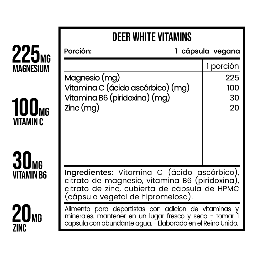 Vitamina C (ácido ascórbico), citrato de magnesio, vitamina B6 (piridoxina), citrato de zinc, cubierta de cápsula de HPMC (cápsula vegetal de hipromelosa). Fabricado en el Reino Unido.